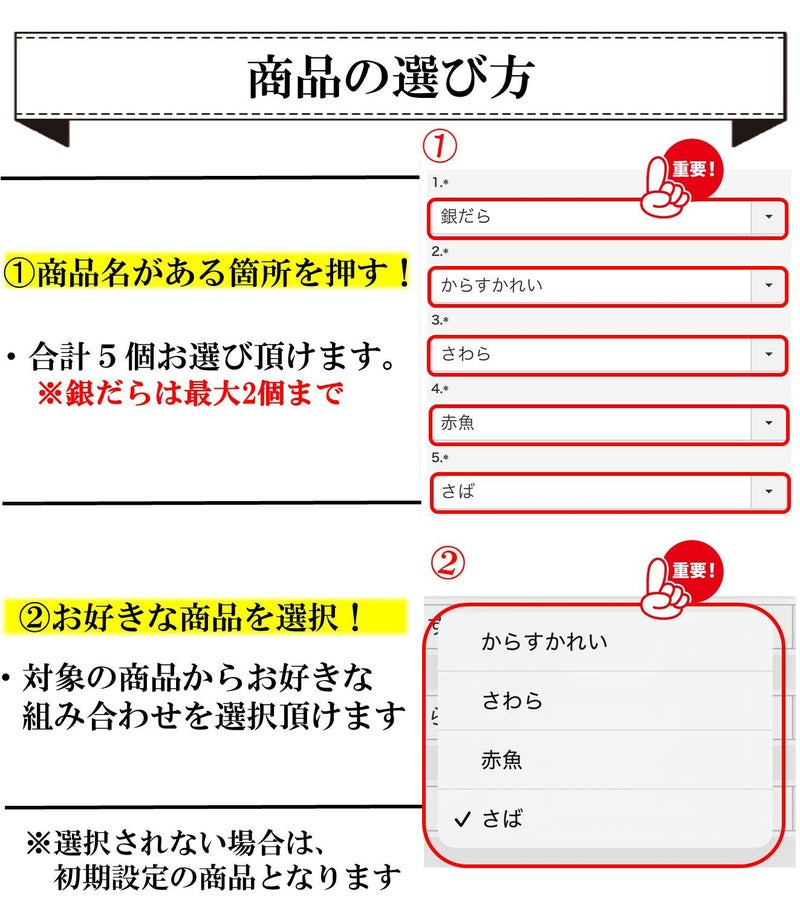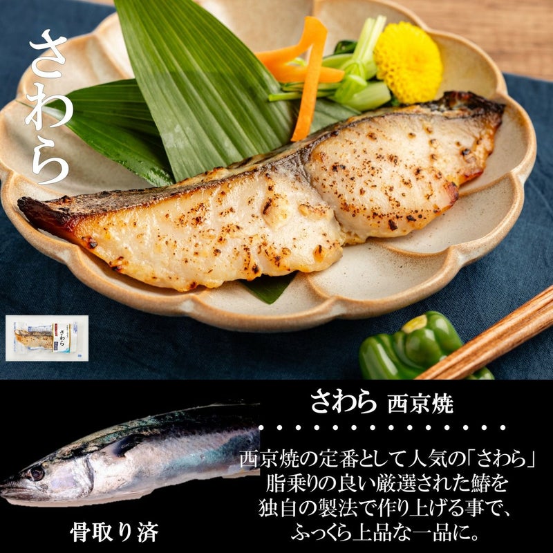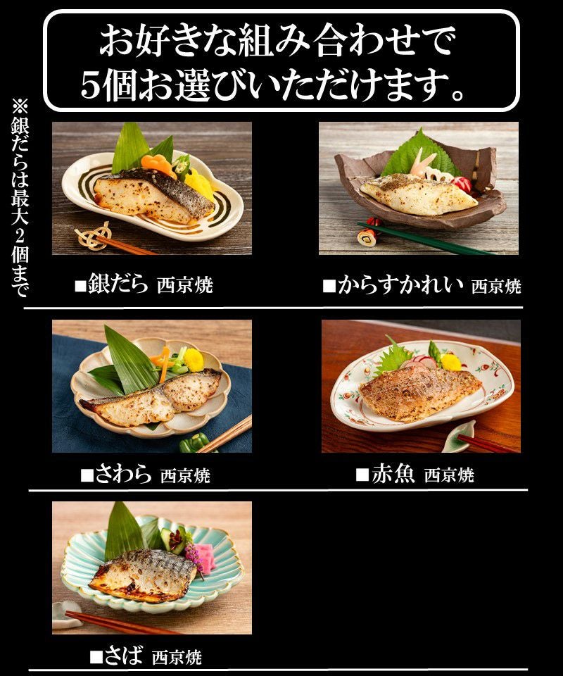 ・銀だら 1パック(60g) ×1個 ・からすかれい 1パック(60g) × 1個 ・さわら 1パック(60g) × 1個 ・赤魚 1パック(60g) ×1個 ・さば 1パック(60g) ×1個 西京焼 各種1個ずつ 合計5個 | |