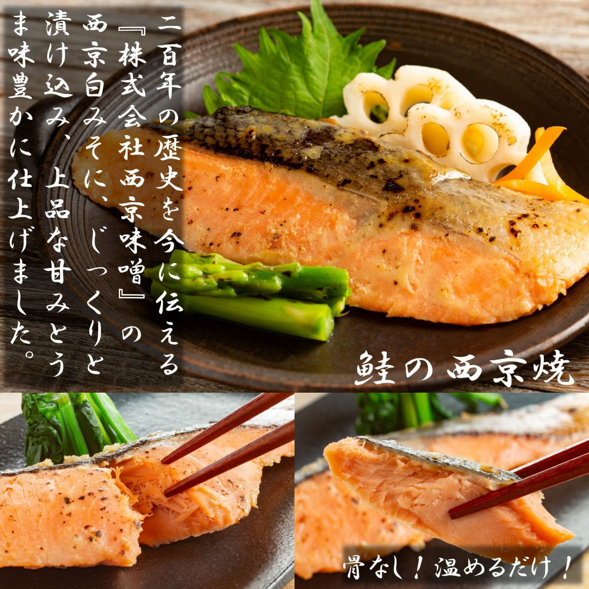 二百年の歴史を今に伝える『株式会社西京味噌』の西京白みそに、鮭をしっくりと漬け込み、上品な甘みとうま味豊かな西京焼に仕上げました。