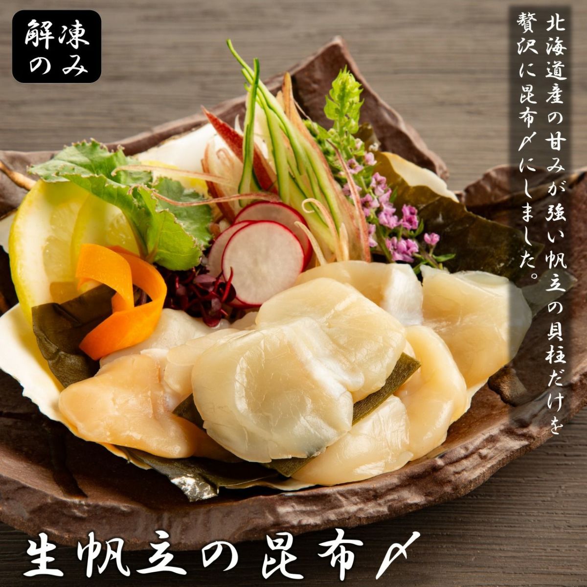 北海道産の甘みが強い帆立の貝柱だけを贅沢に昆布〆にしました。昆布のうま味成分が帆立自信が持つ優しい甘みをさらに引き出します。