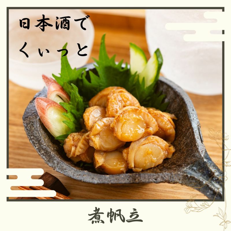 【炙り海老】 エネルギー115kcal,タンパク質22.5g脂質0.5g炭水化物4.5g,食塩相当量1.2g 【煮帆立】 エネルギー227kcal,タンパク質23.5g脂質10.7g炭水化物9.2g,食塩相当量1.9g 【小柱】 エネルギー87kcal,タンパク質10.0g脂質1.1g炭水化物5.2g,食塩相当量1.1g |