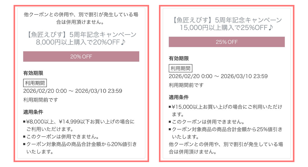 (例)8,000円以上購入20%OFF+15,000円以上購入25%OFFクーポン 【×】