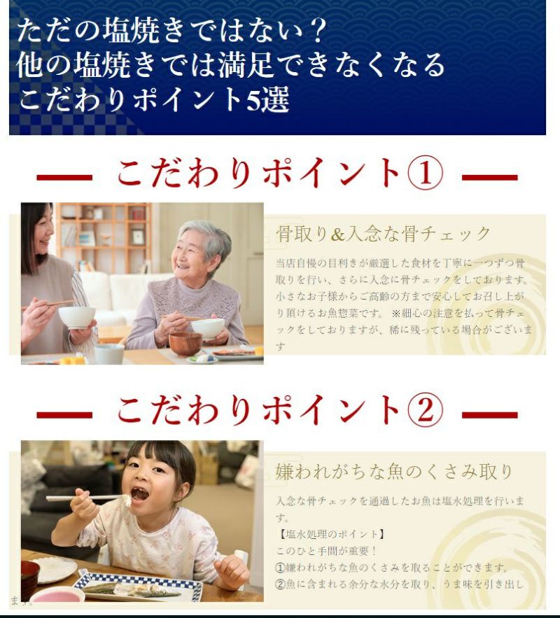 当店自慢の職人が一切れずつ丁寧に塩を振ることにより、均一かつバツグンの塩加減になり、食欲そそる一品になります。 魚と塩だけなので無添加となります。