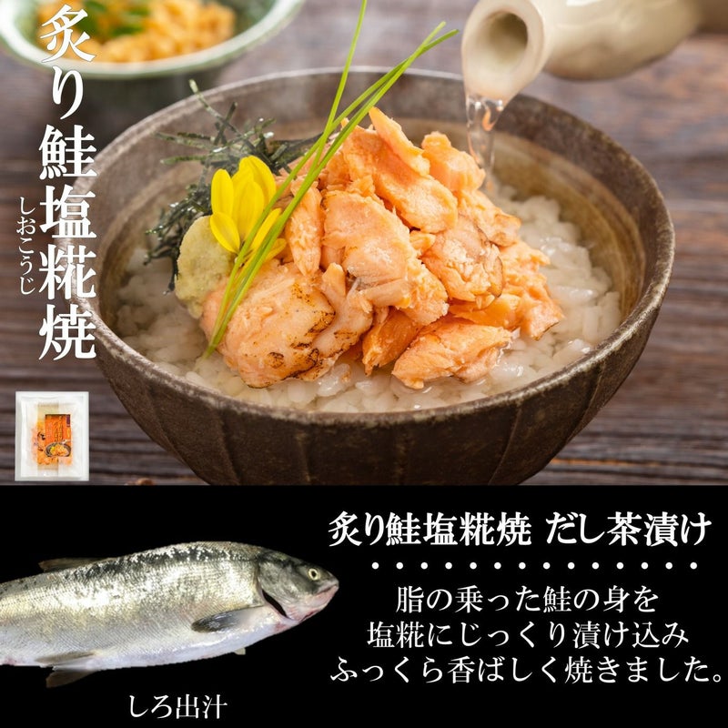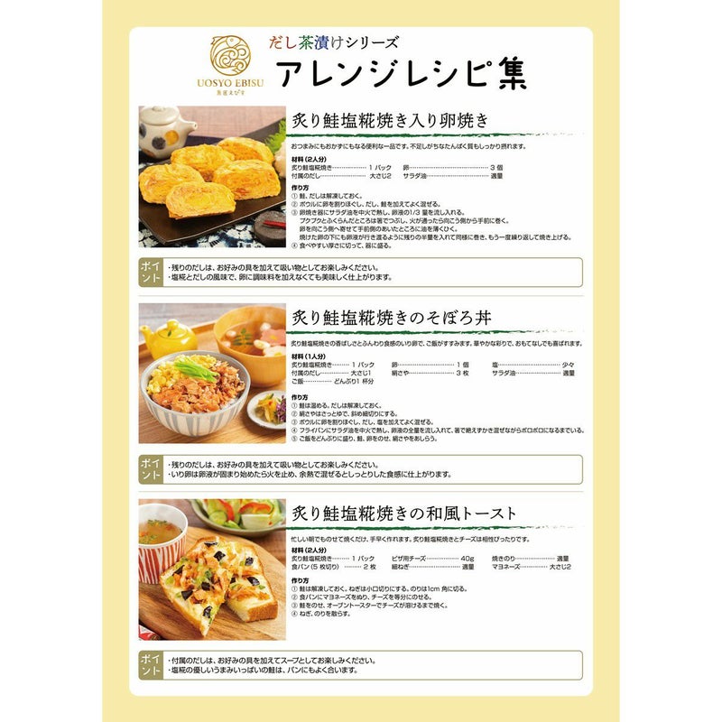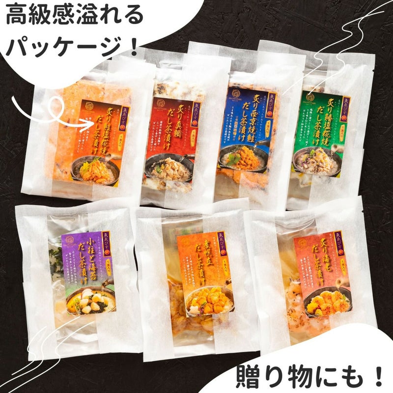 【炙り西京焼鮭 だし茶漬け】 1個 ・西京焼鮭ほぐし ・お出汁 ・わさび 【炙り真鯛 だし茶漬け】 1個 ・真鯛の炙り焼き ・お出汁 ・わさび 【炙り鮭塩糀焼 だし茶漬け】 1個 ・鮭塩糀焼きほぐし ・お出汁 ・わさび 【炙り鰆塩糀焼 だし茶漬け】 1個 ・鰆塩糀焼きほぐし ・お出汁 ※柚子風味を味わって頂く為、わさびは入っておりません。 【炙り海老 だし茶漬け】 1個 ・炙り海老 ・海老茶漬け出汁 ・わさび 【煮帆立 だし茶漬け】 1個 ・煮帆立 ・貝出汁 ・わさび 【小柱と海苔 だし茶漬け】 1個 ・小柱 ・貝出汁 ・わさび ・青さのり 合計7個入り | |